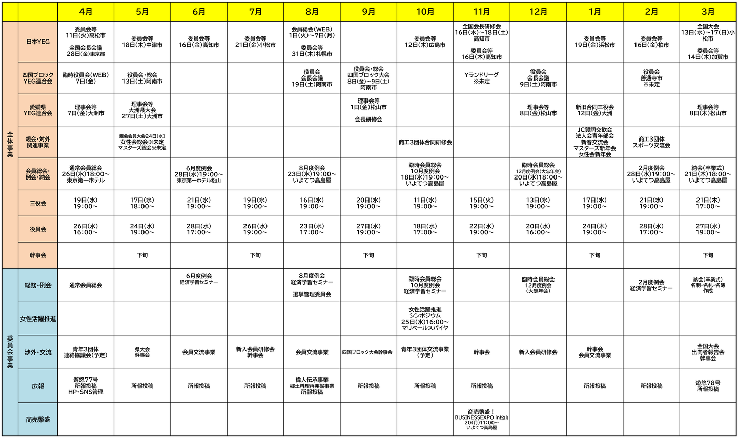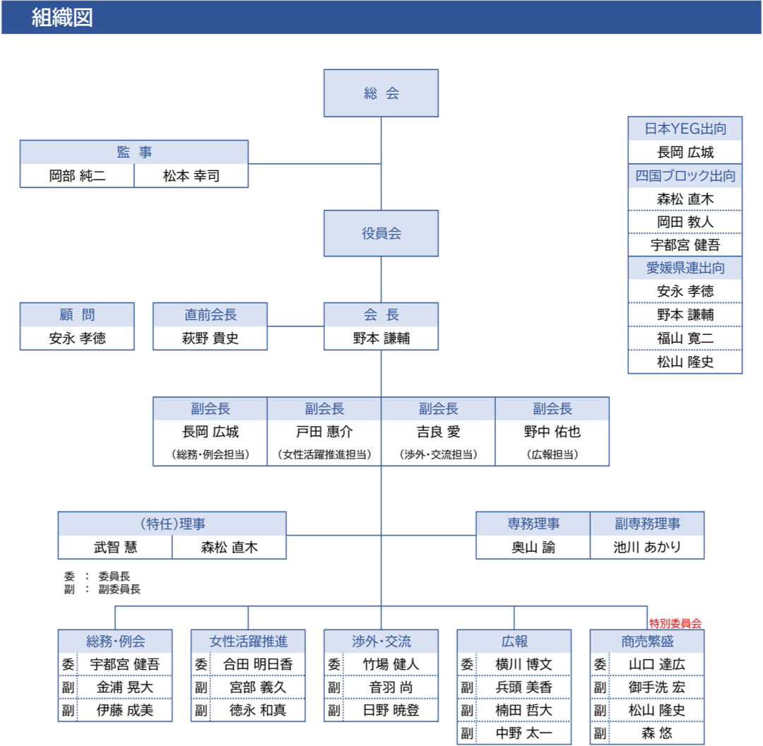 交流の場=情報交換の場を提供することにより会員企業を発展させ、そして郷土松山を牽引する起業家の輩出に立ち向かうことで、松山YEGの存在価値を高めます。まずは自らを先導者とし、この困難な時代を切り拓く仲間達と希望にあふれた未来を作りましょう。