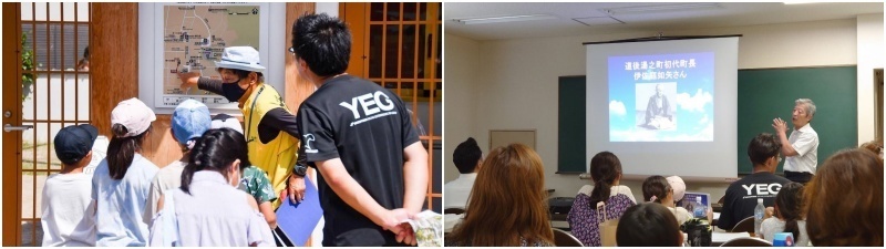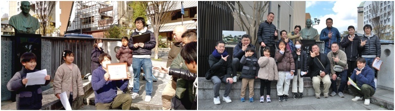 この日、松山市で開催された四国ブロックYEG交流事業(主催:四国ブロックYEG連合会)の中で、四国各地から参加された総勢56名のYEG会員を前に子どもたちが如矢翁の語り部に挑戦。①伊佐庭如矢翁像前(道後温泉本館横) ②道後温泉駅前 ③伊佐庭如矢翁石碑(ふなや横)の三か所で、大人たちに対して偉人の功績や想いを語り、クイズも交えながらガイドしました。